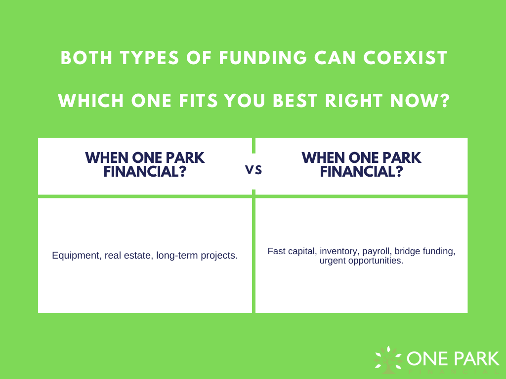 One Park Financial doesn't compete with SBA loans—it complements them. Many successful businesses use multiple financing sources for different purposes. An SBA loan might fund long-term equipment or real estate, while One Park Financial provides working capital for inventory, bridge financing during seasonal fluctuations, or quick funding for time-sensitive opportunities.