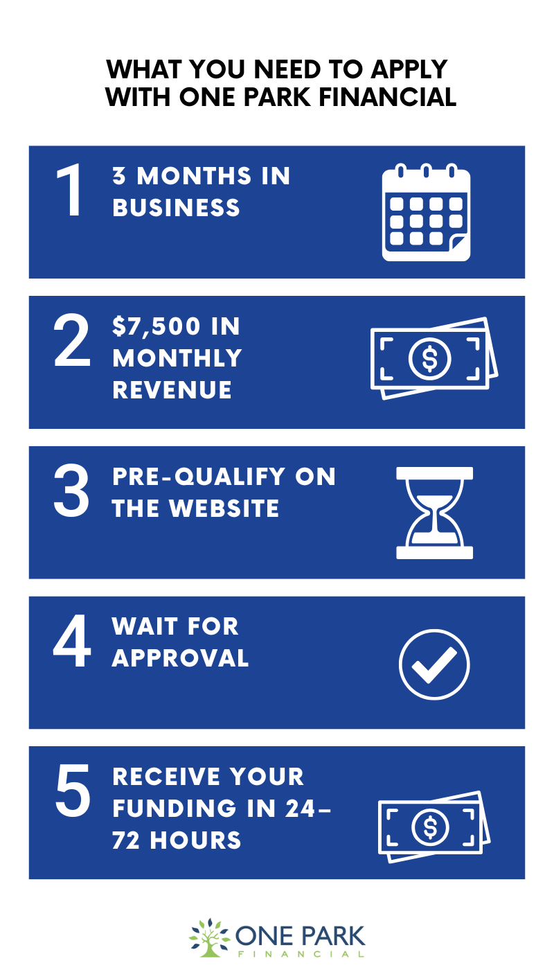 According to One Park Financial's FAQ, the company facilitates working capital through a simplified process with minimal requirements: at least 3 months in business and $7,500 in gross monthly revenues. The company offers a simple one-page application rather than extensive documentation, and can facilitate funding in as little as 24-72 hours.