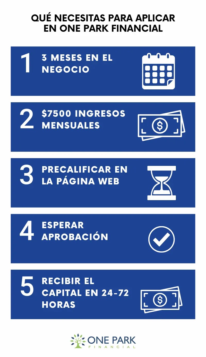 Según las preguntas frecuentes de One Park Financial, la compañía facilita capital de trabajo a través de un proceso simplificado con requisitos mínimos: al menos 3 meses en el negocio y $7,500 en ingresos brutos mensuales. La compañía ofrece una solicitud simple de una página en lugar de documentación extensa y puede facilitar financiamiento en tan solo 24-72 horas.
