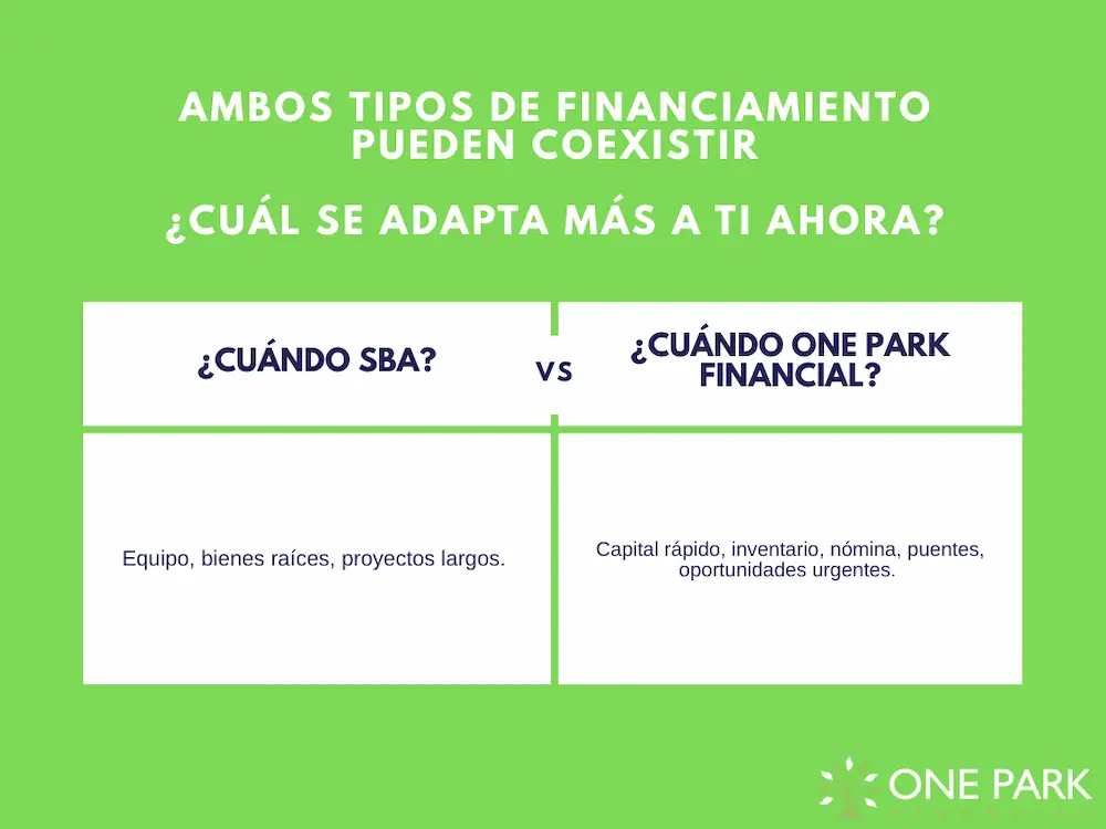La relación entre préstamos de la SBA y financiamiento alternativo es complementaria, no competitiva. One Park Financial ha construido su negocio asegurando que las pequeñas y medianas empresas tengan acceso al capital, ya sea buscando préstamos de la SBA, necesitando alternativas más rápidas, o requiriendo financiamiento suplementario junto al financiamiento tradicional.