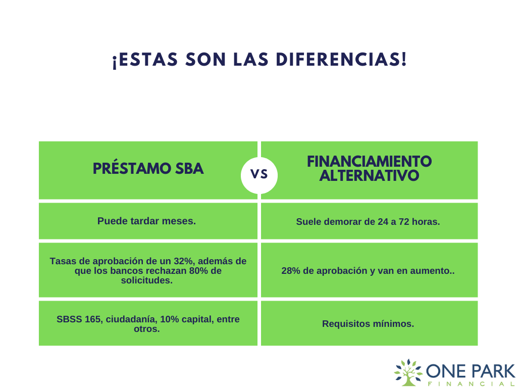 Para empresas que no cumplen con los estrictos requisitos de la SBA, ya sea debido a puntajes de crédito por debajo de 165, estructuras de propiedad que no cumplen con los nuevos requisitos de ciudadanía, tiempo limitado en el negocio, o necesidades de capital urgentes, One Park Financial ofrece soluciones alternativas accesibles.